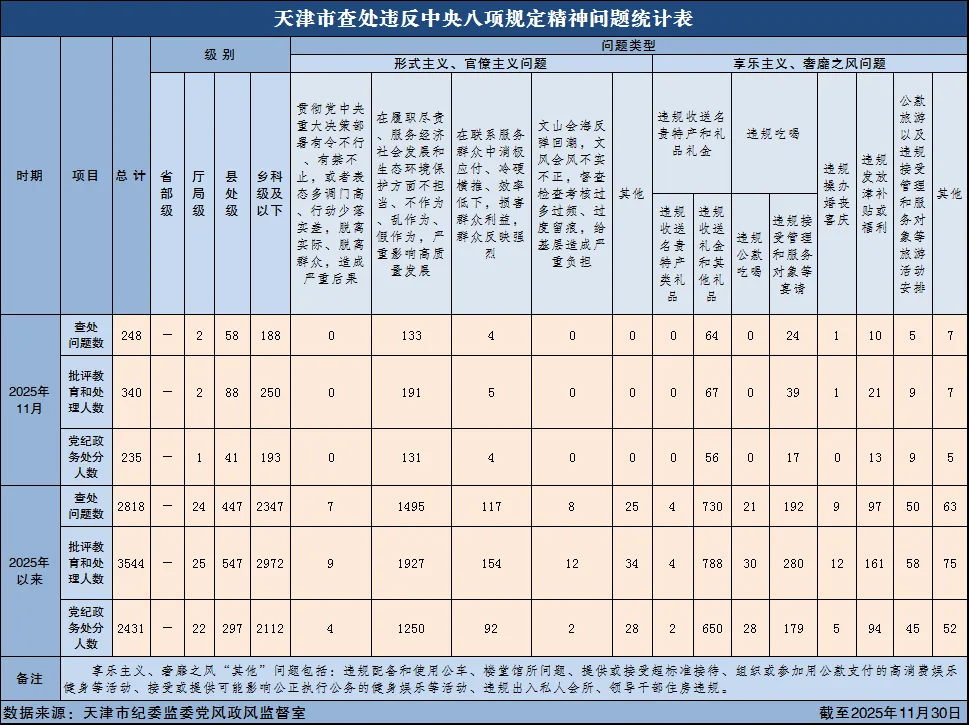 2025年以来,截至11月30日,天津市查处违反中央八项规定精神问题情况如下: