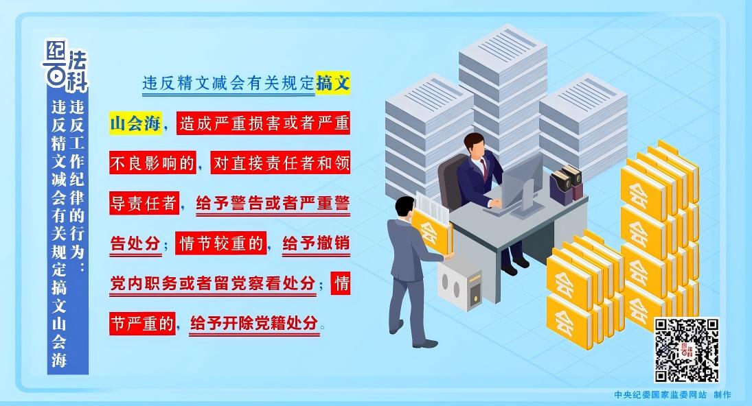 2023年12月修订印发的《中国共产党纪律处分条例》将“违反精文减会有关规定搞文山会海”行为纳入处分范围,规定违反精文减会有关规定搞文山会海,造成严重损害或者严重不良影响的,对直接责任者和领导责任者,给予警告或者严重警告处分;情节较重的,给予撤销党内职务或者留党察看处分;情节严重的,给予开除党籍处分。